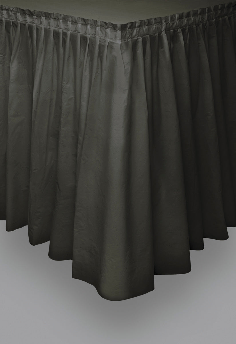 Elevate any event with our Black Plastic Table Skirt! This 29in x 14ft skirt adds a touch of elegance to banquets, award ceremonies, and buffet tables. Easy to set up and durable, it's the perfect addition to any occasion. Make a lasting impression with this package of 1 table skirt. Table skirts are designed to cover one long side and the two short sides of a standard size rectangular banquet table.