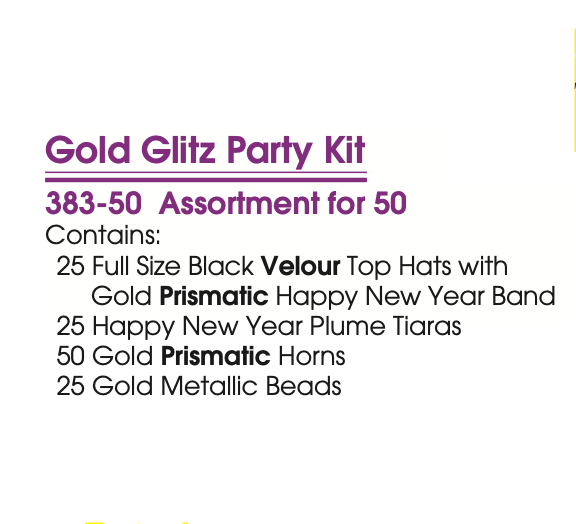 Celebrate in style and ring in the New Year with this Gold Glitz New Year’s Eve Party Kit for 50, perfect for parties, events, bars, and large gatherings. Designed with classic black and gold accents, this all-in-one kit makes it easy to outfit your guests with festive accessories that shine all night long.