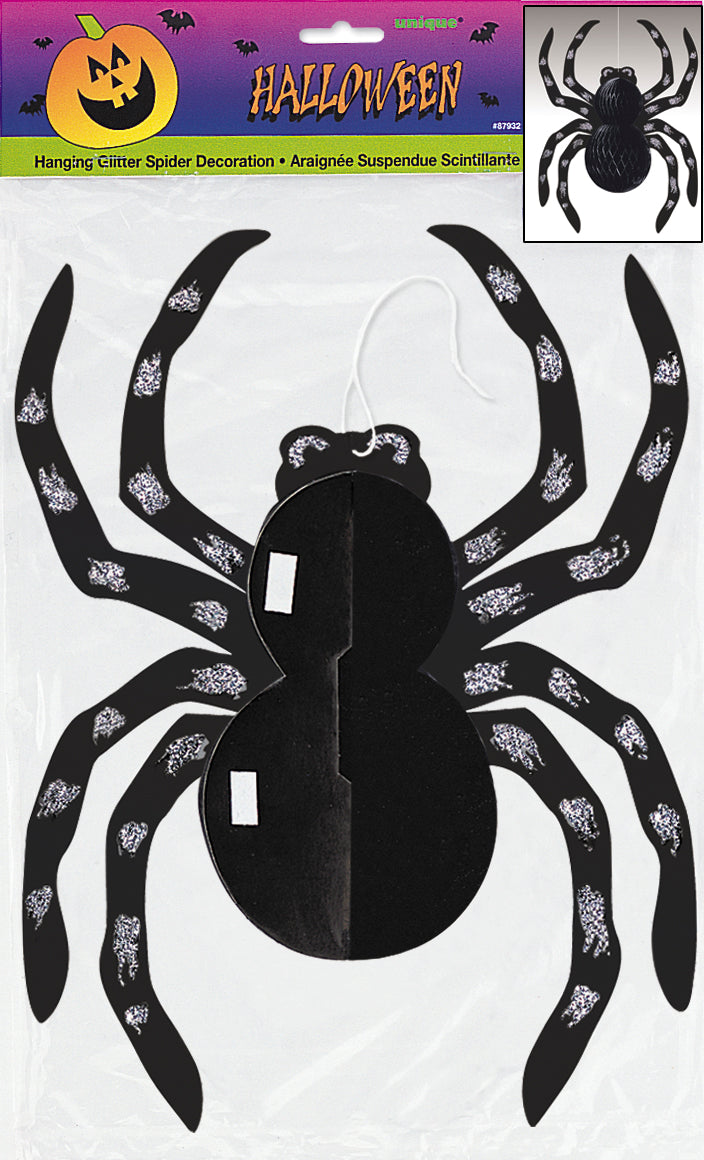 Spider Glitter Hanging Honeycomb Decoration – 14" Halloween Hanging Decor | Black Spider Party Decoration