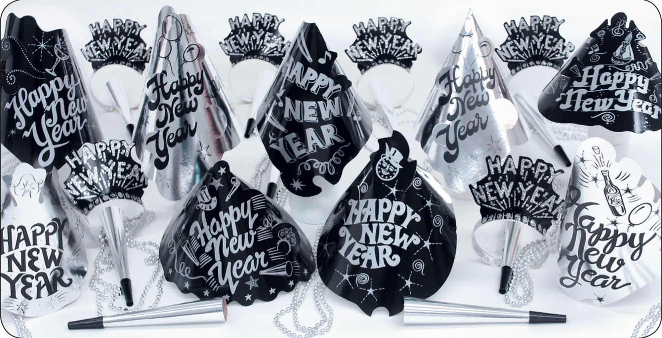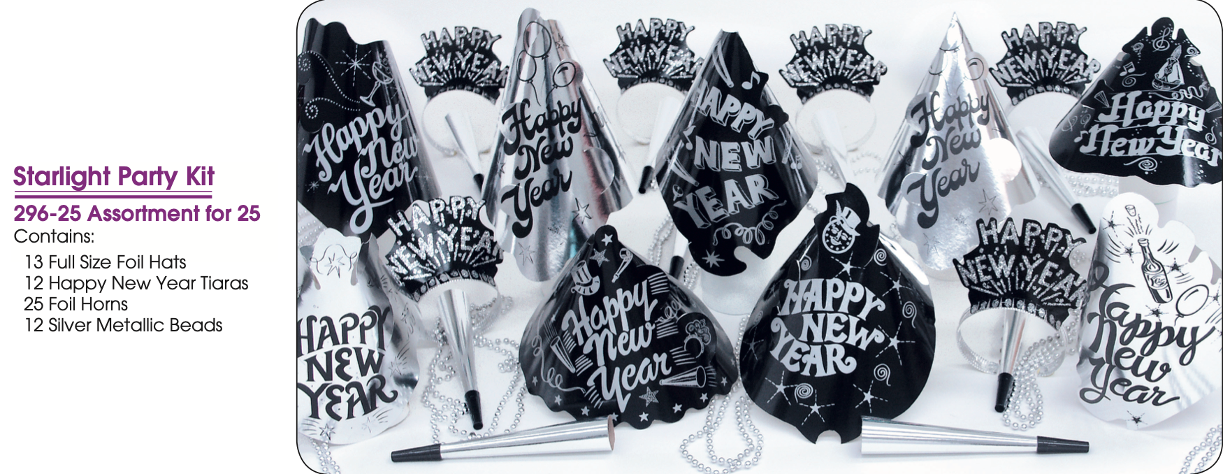 Celebrate New Year’s Eve in elegance and style with the Starlight New Year’s Eve Party Kit for 25 – Silver and Black Hats, Tiaras, Foil Horns & Beads. This deluxe party kit provides everything you need to make your celebration fun, festive, and glamorous for 25 guests.